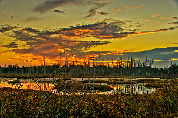 Photograph of a sunset in the Pine lands of New Jersey in an old cranberry bog.
