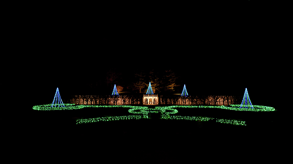 Christmas trees with display lights at night located at Longwood gardens.