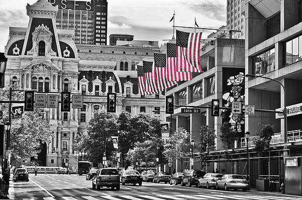 A black & white photograph with selective color of city hall in City of Brotherly Love - Philadelphia along market street.